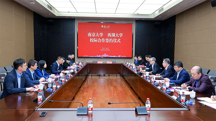 談?wù)苊舸韺W(xué)校對施一公等學(xué)校代表團一行的到來表示熱烈歡迎及誠摯問候。他指出,西湖大學(xué)自成立以來,始終聚焦基礎(chǔ)前沿科學(xué)研究,致力尖端科技突破,注重學(xué)科交叉融合,取得了令人矚目的辦學(xué)成績;南京大學(xué)和西湖大學(xué)地緣相近、辦學(xué)理念相近,合作交流日趨密切;本次簽約是深入貫徹落實黨的二十屆三中全會精神和全國教育大會精神的務(wù)實之舉,也是兩?;W(xué)互鑒、深化合作的重要契機。他期待,在未來的合作中雙方一步加強人才聯(lián)合培養(yǎng)、科研合作、體制機制改革探索,為共同推進我國高等教育改革做出新的更大貢獻。