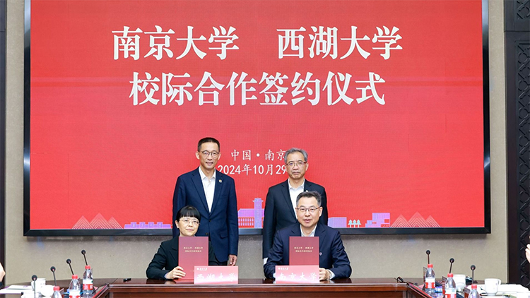 南京大學(xué)黨委常委、副校長王振林,西湖大學(xué)副校長、學(xué)校秘書長朱曉蕓代表雙方簽署校際合作框架協(xié)議。