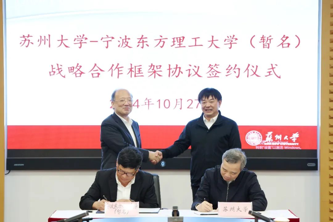 10月27日,寧波東方理工大學(xué)(暫名)與蘇州大學(xué)戰(zhàn)略合作框架協(xié)議簽訂儀式在蘇州大學(xué)天賜莊校區(qū)舉行,雙方將在科研合作、師資隊伍建設(shè)、學(xué)生交流、博士生聯(lián)合培養(yǎng)等方面推動合作,服務(wù)國家戰(zhàn)略,助力創(chuàng)新驅(qū)動發(fā)展。中國科學(xué)院院士、我校校長陳十一,中國工程院院士、蘇州大學(xué)校長應(yīng)漢杰出席儀式并講話,寧波東方理工大學(xué)(暫名)副校長鄭春苗與蘇州大學(xué)副校長沈明榮代表雙方簽約。蘇州大學(xué)副校長姚建林出席此次簽約儀式。