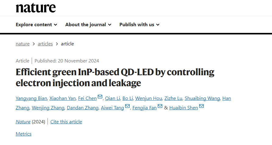 11月21日,河南大學(xué)申懷彬教授團(tuán)隊(duì)在量子點(diǎn)領(lǐng)域的研究成果以“Efficient green InP-based QD-LED by controlling electron injection and leakage”為題,在國(guó)際頂級(jí)期刊《自然》發(fā)表標(biāo)志著無(wú)毒量子點(diǎn)LED技術(shù)取得重要進(jìn)展,這是河南大學(xué)首次作為第一通訊單位在《自然》期刊發(fā)表研究成果。
