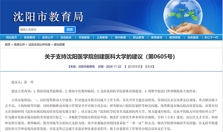 近日,沈陽市教育局網(wǎng)站發(fā)布《關(guān)于支持沈陽醫(yī)學(xué)院創(chuàng)建醫(yī)科大學(xué)的建議(第0605號)》,其中提到,市教育局正在加快研制《沈陽市屬高校高質(zhì)量發(fā)展實施方案》,該方案已將“沈陽醫(yī)學(xué)院更名為沈陽醫(yī)科大學(xué)、努力建成有特色、高水平的地方應(yīng)用型醫(yī)科大學(xué)”作為沈陽市發(fā)展市屬高校的重要建設(shè)目標(biāo)之一。為配合沈陽醫(yī)學(xué)院升格醫(yī)科大學(xué)建設(shè),市財政部門在2024年部門預(yù)算安排基礎(chǔ)上,籌措資金1000萬元支持醫(yī)學(xué)院購置教學(xué)科研設(shè)備,助力學(xué)校高水平醫(yī)科大學(xué)建設(shè)。