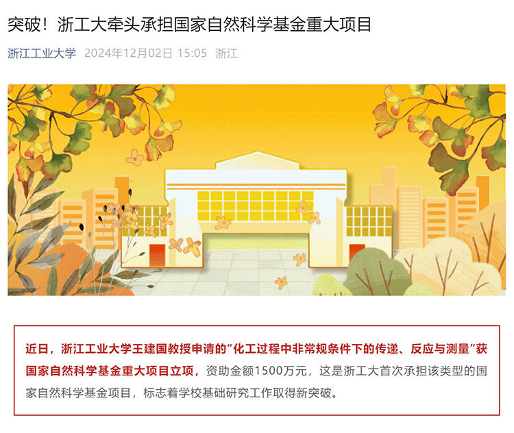浙江工業(yè)大學(xué)王建國(guó)教授申請(qǐng)的“化工過(guò)程中非常規(guī)條件下的傳遞、反應(yīng)與測(cè)量”獲國(guó)家自然科學(xué)基金重大項(xiàng)目立項(xiàng),資助金額1500萬(wàn)元,這是浙工大首次承擔(dān)該類型的國(guó)家自然科學(xué)基金項(xiàng)目,標(biāo)志著學(xué)校基礎(chǔ)研究工作取得新突破……>>查看詳情