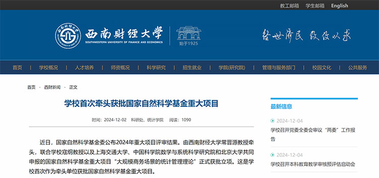 由西南財(cái)經(jīng)大學(xué)常晉源教授牽頭,聯(lián)合學(xué)校寇綱教授以及上海交通大學(xué)、中國(guó)科學(xué)院數(shù)學(xué)與系統(tǒng)科學(xué)研究院和北京大學(xué)共同申報(bào)的國(guó)家自然科學(xué)基金重大項(xiàng)目“大規(guī)模商務(wù)場(chǎng)景的統(tǒng)計(jì)管理理論”正式獲批立項(xiàng)。這是西南財(cái)經(jīng)大學(xué)首次作為牽頭單位獲批國(guó)家自然科學(xué)基金重大項(xiàng)目……>>查看詳情