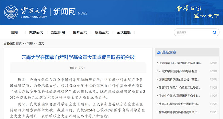 云南大學(xué)牽頭聯(lián)合中國(guó)科學(xué)院植物研究所、中國(guó)農(nóng)業(yè)科學(xué)院農(nóng)業(yè)基因組研究所、山西農(nóng)業(yè)大學(xué)、四川農(nóng)業(yè)大學(xué)申報(bào)的國(guó)家自然科學(xué)基金重大項(xiàng)目“糧食作物多年生特性的基礎(chǔ)研究”正式獲批立項(xiàng)。這是云南大學(xué)基礎(chǔ)研究項(xiàng)目自2022年以來(lái)第二次獲國(guó)家自然科學(xué)基金重大項(xiàng)目立項(xiàng)支持?!?a href="http://m.airsoftnewmexico.com/news/dongtai/202412/t20241209_2645417.shtml">>>查看詳情