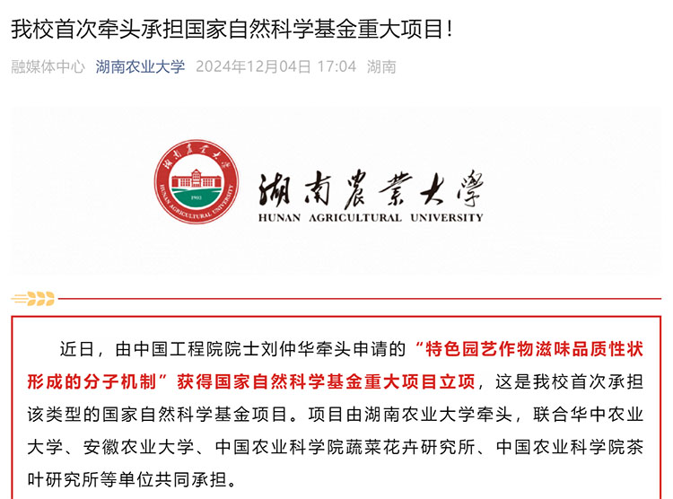由中國(guó)工程院院士劉仲華牽頭申請(qǐng)的“特色園藝作物滋味品質(zhì)性狀形成的分子機(jī)制”獲得國(guó)家自然科學(xué)基金重大項(xiàng)目立項(xiàng),這是湖南農(nóng)業(yè)大學(xué)首次承擔(dān)該類型的國(guó)家自然科學(xué)基金項(xiàng)目。項(xiàng)目由湖南農(nóng)業(yè)大學(xué)牽頭,聯(lián)合華中農(nóng)業(yè)大學(xué)、安徽農(nóng)業(yè)大學(xué)、中國(guó)農(nóng)業(yè)科學(xué)院蔬菜花卉研究所、中國(guó)農(nóng)業(yè)科學(xué)院茶葉研究所等單位共同承擔(dān)……>>查看詳情