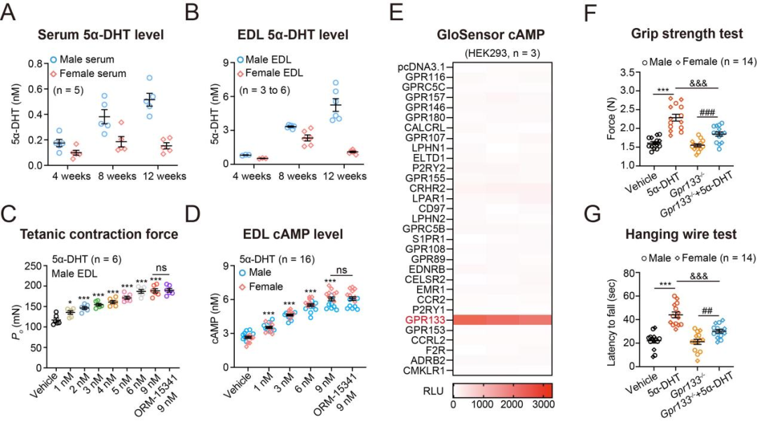 DHT是人體內(nèi)作用最強(qiáng)的雄激素,不僅決定性器官的發(fā)育和第二性征的形成(如體毛、聲音變化等),還廣泛參與人體能量代謝、免疫系統(tǒng)調(diào)節(jié)、大腦功能以及某些疾病(如腫瘤)的發(fā)生發(fā)展。研究發(fā)現(xiàn),DHT可能通過(guò)細(xì)胞膜上的某種特殊受體起作用。骨骼肌中的一種名為GPR133的蛋白質(zhì)是DHT的膜受體。當(dāng)這個(gè)受體被敲除后,小鼠對(duì)DHT增強(qiáng)肌肉收縮力的反應(yīng)顯著減弱。這表明,GPR133是DHT快速作用的重要開(kāi)關(guān)。