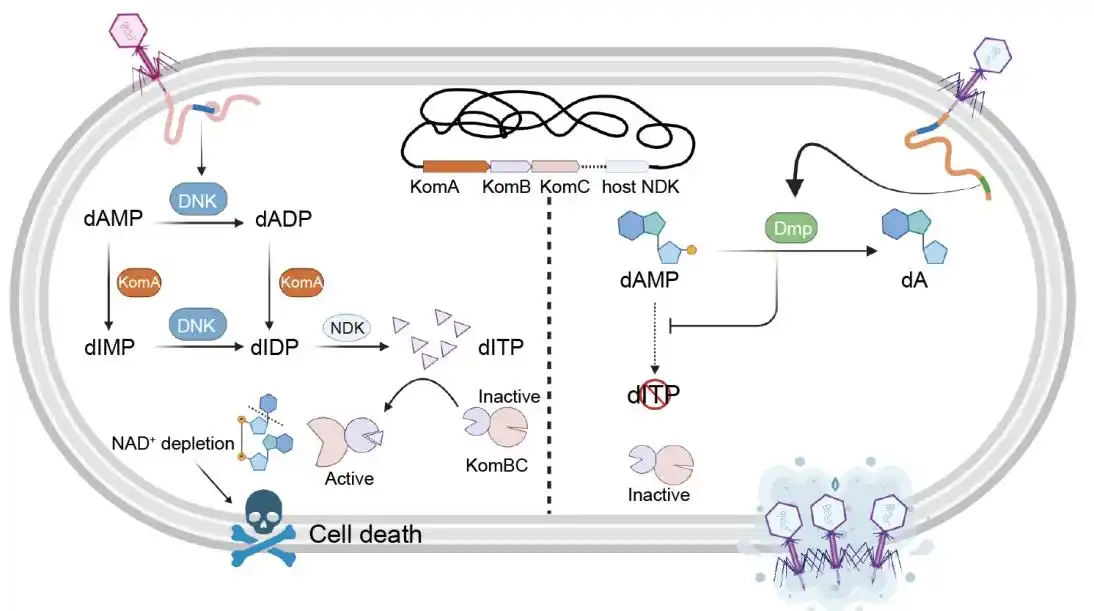 在微觀世界里,細(xì)菌與病毒之間每天都在上演著攻防大戰(zhàn)。生物體內(nèi)的信號(hào)傳遞如同精密的通信網(wǎng)絡(luò),而核苷酸分子長(zhǎng)期被認(rèn)為是關(guān)鍵的“信號(hào)兵”。自1950年代發(fā)現(xiàn)環(huán)狀核苷酸(如cAMP、cGMP)以來,科學(xué)家已解析了其在代謝調(diào)節(jié)、免疫應(yīng)答中的核心作用,相關(guān)研究多次獲得諾貝爾獎(jiǎng)。不同于環(huán)狀核苷酸的免疫作用,非典型核苷酸在過去普通被認(rèn)為不發(fā)揮任何生理作用。然而,研究團(tuán)隊(duì)通過基因分析,鎖定了一個(gè)由KomA(孔明A)、KomB(孔明B)、KomC(孔明C)三個(gè)蛋白組成的防御系統(tǒng)。當(dāng)噬菌體入侵時(shí),其攜帶的脫氧核苷酸激酶(DNK)意外成為激活細(xì)菌免疫的“開關(guān)”:KomA與DNK協(xié)作,將核苷酸(dAMP)轉(zhuǎn)化為特殊信號(hào)分子dITP。這種分子能觸發(fā)KomC蛋白分解細(xì)胞內(nèi)的關(guān)鍵物質(zhì)NAD?,導(dǎo)致噬菌體因“能源枯竭”無法復(fù)制。令人稱奇的是,該系統(tǒng)巧妙利用入侵者攜帶的酶完成防御,正如三國(guó)時(shí)期諸葛亮“草船借箭”的智謀,因此被命名為“孔明系統(tǒng)”。這種堿基修飾核苷酸的信號(hào)傳導(dǎo)模式突破了環(huán)狀核苷酸作為信號(hào)分子的經(jīng)典理論體系,首次證實(shí)非典型核苷酸同樣具有免疫調(diào)控功能。