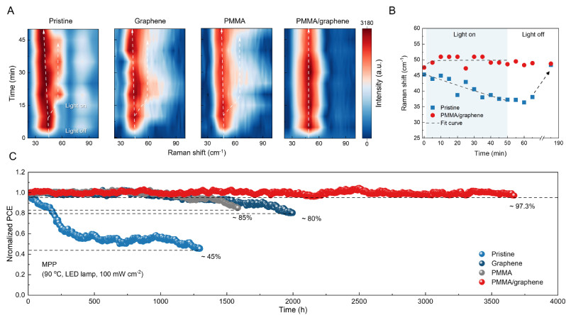 得益于石墨烯出色的機(jī)械性能和聚合物的耦合效應(yīng),鈣鈦礦薄膜的模量和硬度提高了兩倍,并顯著限制了在光照條件下的晶格動(dòng)態(tài)伸縮效應(yīng)。研究表明,石墨烯-聚合物雙層結(jié)構(gòu)將晶格變形率從+0.31%降低至+0.08%,有效減少了晶界附近由膨脹引起的材料破壞。