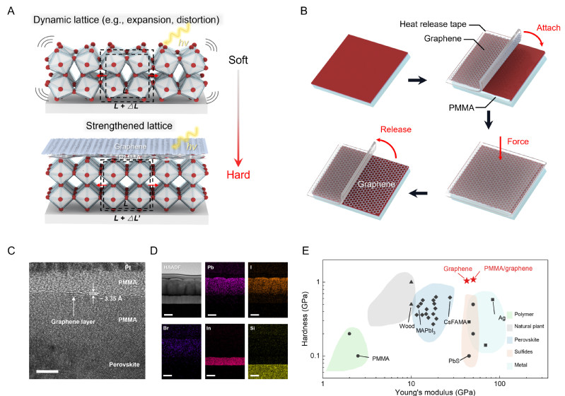 北京時(shí)間3月7日凌晨,華東理工大學(xué)材料學(xué)院清潔能源材料與器件團(tuán)隊(duì)侯宇教授、楊雙教授等人在Science(《科學(xué)》)發(fā)表題為“Graphene-polymer reinforcement of perovskite lattices for durable solar cells”的最新研究成果。該研究發(fā)現(xiàn)了鈣鈦礦光伏不穩(wěn)定性的關(guān)鍵機(jī)制——光機(jī)械誘導(dǎo)分解效應(yīng),提出石墨烯-聚合物機(jī)械增強(qiáng)鈣鈦礦材料的新方法,制備的太陽(yáng)能電池器件在標(biāo)準(zhǔn)太陽(yáng)光照及高溫下的T97工作壽命創(chuàng)下3670小時(shí)新紀(jì)錄,該研究成果將為鈣鈦礦太陽(yáng)電池的產(chǎn)業(yè)化應(yīng)用提供全新解決方案。