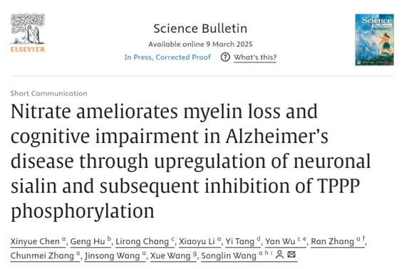 近日,首都醫(yī)科大學基礎醫(yī)學院口腔健康北京實驗室王松靈院士團隊在《Science Bulletin》上發(fā)表題為“Nitrate ameliorates myelin loss and cognitive impairment in Alzheimer's disease through upregulation of neuronal sialin and subsequent inhibition of TPPP phosphorylation”的研究論文。該研究發(fā)現(xiàn)硝酸鹽顯著緩解阿爾茨海默病(AD)模型小鼠髓鞘丟失并有效改善其認知障礙,并揭示硝酸鹽上調神經元硝酸鹽轉運蛋白(Sialin),進一步降低AD模型小鼠海馬促微管蛋白聚合蛋白(TPPP)的磷酸化是其緩解AD的機制,該研究為AD治療靶點和治療策略的開發(fā)提供重要理論依據(jù)。首都醫(yī)科大學基礎醫(yī)學院口腔健康北京實驗室博士后陳欣月為第一作者,王松靈院士為通訊作者。
