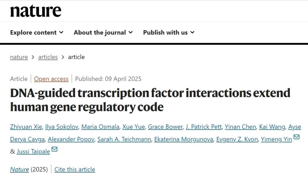 北京時間4月9日23時,同濟大學醫(yī)學院、同濟大學附屬東方醫(yī)院心臟病全國重點實驗室尹貽蒙研究團隊與劍橋大學研究團隊合作研究成果在線發(fā)表于《自然》(Nature)雜志,論文題為“DNA-guided transcription factor interactions extend human gene regulatory code“(DNA介導的轉(zhuǎn)錄因子間協(xié)同作用延展了人類基因調(diào)控密碼)。