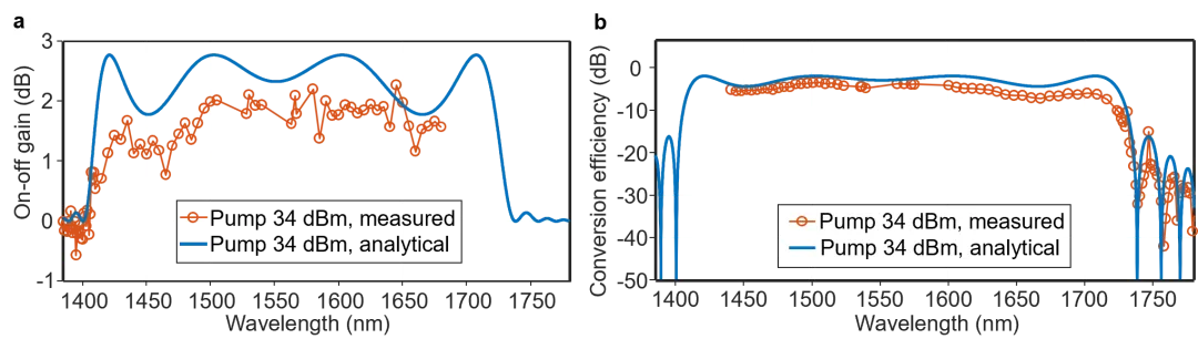 基于以上重大挑戰(zhàn),趙平團(tuán)隊提出基于“脊形減模+彎曲濾?!奔夹g(shù)的單模、負(fù)色散非線性集成光波導(dǎo)設(shè)計普適性方法,原理上消除了過往參量放大非線性多模集成光波導(dǎo)中的隨機(jī)模式串?dāng)_。團(tuán)隊以超低損耗非線性氮化硅集成平臺為例,制備出具有平坦傳輸光譜的、單模負(fù)色散非線性集成光波導(dǎo)芯片,如圖1所示。團(tuán)隊還進(jìn)一步發(fā)展了非線性氮化硅集成光波導(dǎo)中模電模式基模(TE00)二階與四階色散精確協(xié)同調(diào)控技術(shù),實驗中實現(xiàn)了帶寬高達(dá)330nm的片上光參量放大,如圖2所示。該項研究為新一代超大帶寬光放大提供了新思路,在提升光纖/無線光通信容量,擴(kuò)大數(shù)據(jù)中心光互連規(guī)模,提高光學(xué)測量精度,拓展光譜檢測分析范圍等方面有良好的應(yīng)用潛力。