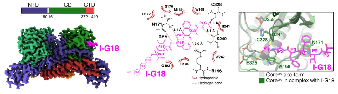因此,為了開發(fā)更強效的新型靶向抑制劑,研究團隊開展了病毒核心蛋白酶底物識別和催化機制的研究。研究人員以核心蛋白酶一種天然底物P25K的序列為基礎(chǔ),設(shè)計了一段C末端醛基取代的底物類似物I-G18。I-G18能夠與核心蛋白酶的催化中心的Cys328共價結(jié)合,模擬催化中間態(tài)的結(jié)構(gòu)特征。研究團隊通過冷凍電鏡技術(shù),解析了這一復(fù)合物的三維結(jié)構(gòu)(圖2)。發(fā)現(xiàn)在底物的誘導(dǎo)下,核心蛋白酶活性中心發(fā)生一系列構(gòu)象變化,在S1和S2位形成特征的狹長口袋,僅可容納P1位Gly和P2位Ala這兩個側(cè)鏈極短的氨基酸,解釋了核心蛋白酶對底物中這兩個位置氨基酸的高度選擇性。