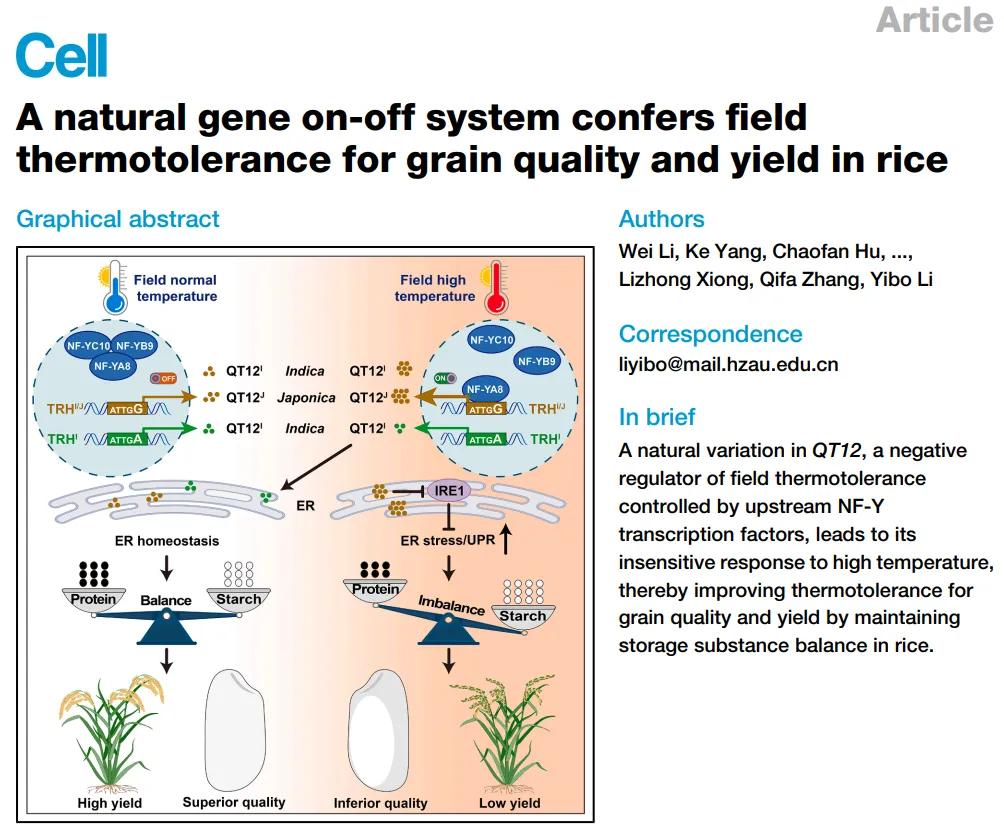 北京時間4月30日,國際期刊《細胞》(Cell)發(fā)表了華中農(nóng)業(yè)大學作物遺傳改良全國重點實驗室、生命科學技術學院、湖北洪山實驗室水稻團隊李一博教授課題組題為“一個天然的基因開關系統(tǒng)協(xié)同賦予水稻品質和產(chǎn)量田間耐熱性”(A natural gene on-off system confers field thermotolerance for grain quality and yield in rice)的研究論文。