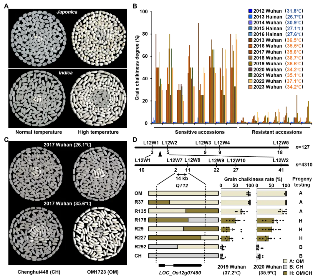在這項研究中,經(jīng)過長達10余年的灌漿期田間自然高溫抗性種質的大量篩選和鑒定,研究團隊利用自主研發(fā)的快速、高通量克隆作物重要農(nóng)藝性狀功能基因的RapMap方法(Zhang et al. NC, 2021),從大田耐熱水稻種質中克隆到首個調控品質耐高溫的主效QTL基因QT12,該基因同時表現(xiàn)出優(yōu)異的產(chǎn)量耐熱性。這一發(fā)現(xiàn)突破了傳統(tǒng)溫室篩選、苗期鑒定方法不能反映真實環(huán)境的局限,解決了長期困擾科學界的“耐高溫表型難鑒定、耐高溫基因難應用”的瓶頸問題。