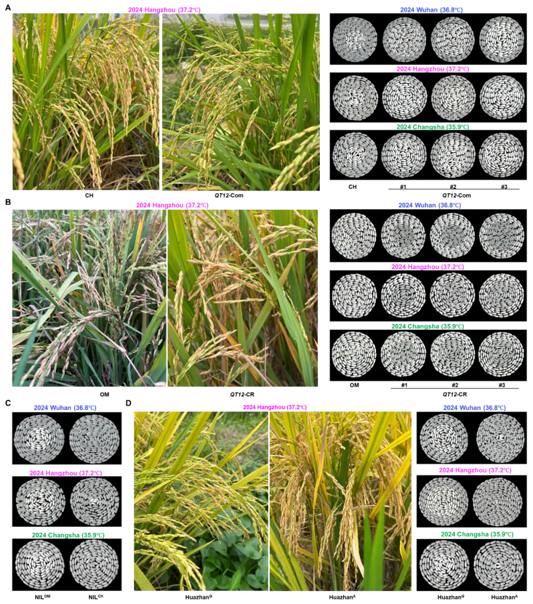 長江流域是我國第一大水稻主產(chǎn)區(qū),種植面積和年產(chǎn)量均約占全國總量的三分之二,然而近10年來該稻區(qū)極端高溫天氣頻發(fā),給水稻穩(wěn)產(chǎn)與優(yōu)質帶來了嚴峻挑戰(zhàn)。然而,QT12基因的研究為這一難題帶來了突破性解決方案。通過2023和2024年武漢、杭州和長沙等長江流域極端高溫下的大規(guī)模田間試驗,低表達QT12基因在高溫環(huán)境下表現(xiàn)出很強的耐熱性:與野生型相比,CRISPR編輯的QT12基因突變株系在武漢、杭州和長沙的小區(qū)產(chǎn)量分別提升了92.5%、64.1%和54.7%,同時顯著降低了稻米堊白率和堊白度,提升了稻米外觀品質和食味品質。