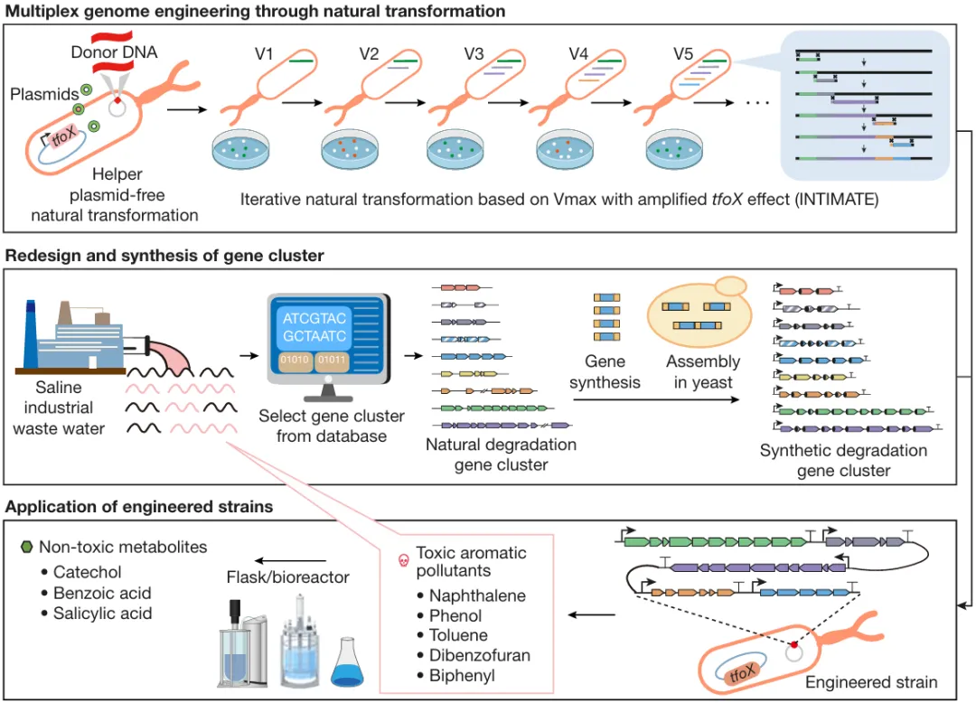 為了攻克這一難題,研究團隊利用合成生物學方法,對兼具快速生長、耐鹽脅迫、基因編輯高效等特性的需鈉弧菌進行基因工程改造,開發(fā)了高效自然轉化方法和基因組迭代編輯技術INTIMATE,這種技術不僅可以將長片段DNA序列精準地插入底盤細胞基因組特定位點,而且通過迭代方法反復多次插入新的DNA序列,實現(xiàn)對同一菌株的不斷拓展改造。經(jīng)多輪迭代編輯后,研究團隊獲得了能夠降解5種典型有機污染物的菌株VCOD-15,并開展了模擬應用測試。結果顯示,在取自石油煉化廠和氯堿化工廠的高鹽廢水中,該菌株僅需2天即可凈化其中同時存在的5種有機污染物。