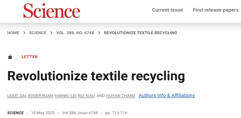 東南大學(xué)能源與環(huán)境學(xué)院肖睿教授、張會(huì)巖教授領(lǐng)銜的綠色能源團(tuán)隊(duì)在國際頂尖學(xué)術(shù)期刊《科學(xué)》(Science)上發(fā)表了題為 “Revolutionize textile recycling(革新廢紡回收)” 的 Letter 文章,針對全球日益嚴(yán)峻的廢紡等高分子固廢問題,提出了創(chuàng)新性的見解與解決方案,呼吁通過跨學(xué)科、跨地域協(xié)同創(chuàng)新,構(gòu)建高效、綠色的高分子固廢回收定向熱轉(zhuǎn)化新范式。