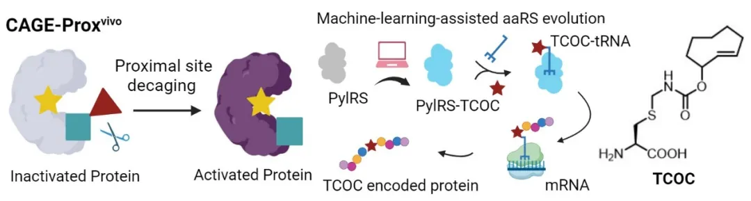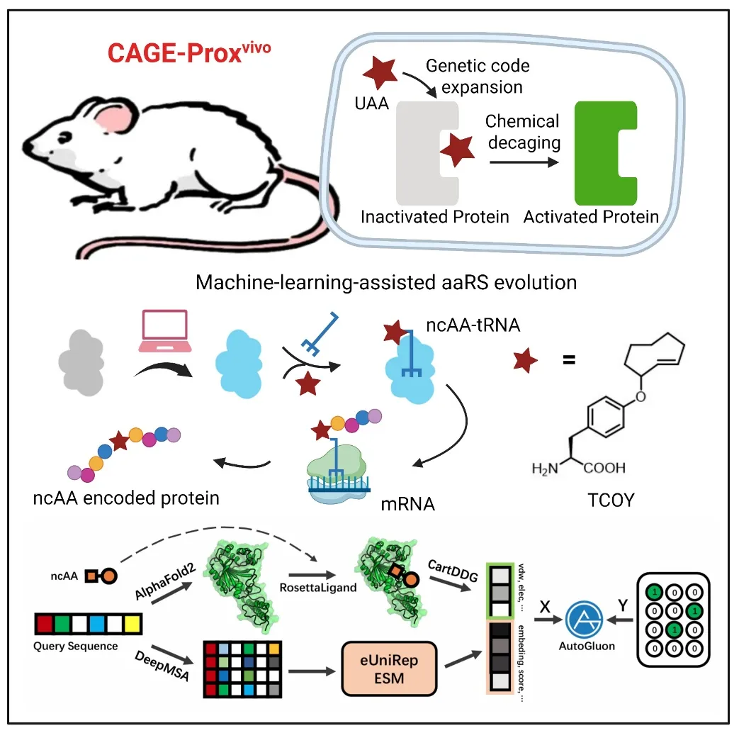 機(jī)器學(xué)習(xí)驅(qū)動的蛋白質(zhì)活體激活策略:通過蛋白語言模型訓(xùn)練機(jī)器學(xué)習(xí)算法,設(shè)計和篩選tRNA合成酶(PylRS)變體,實現(xiàn)了可化學(xué)脫籠的反式環(huán)辛烯-酪氨酸(TCOY)的識別和編碼表達(dá),用于后續(xù)在體蛋白質(zhì)功能激活和互作調(diào)控