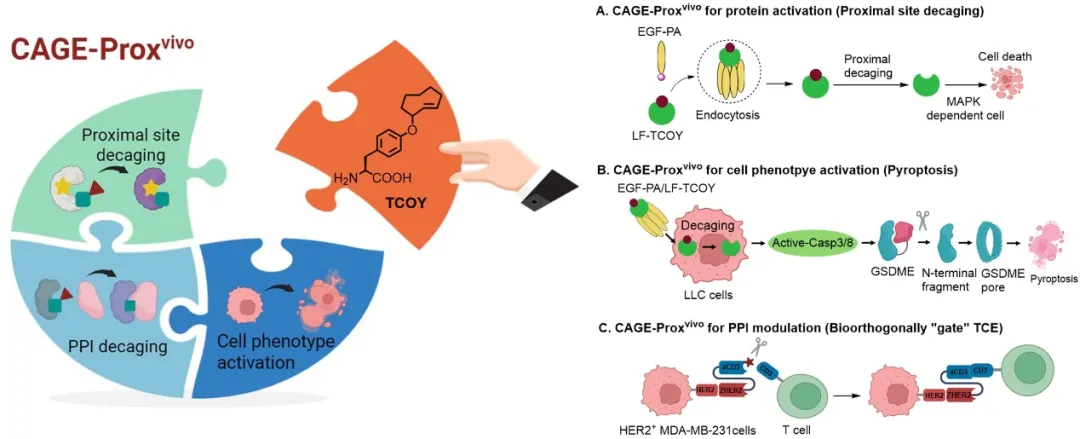 CAGE-Proxvivo蛋白質(zhì)活體原位激活通用平臺應(yīng)用:在活體動物中按需激活蛋白質(zhì)功能;調(diào)節(jié)細(xì)胞表型,誘導(dǎo)腫瘤細(xì)胞發(fā)生焦亡,增強抗腫瘤免疫反應(yīng);精確調(diào)節(jié)蛋白質(zhì)-蛋白質(zhì)相互作用,實現(xiàn)生物正交“門控”雙特異性抗體,用于按需招募和激活T細(xì)胞
