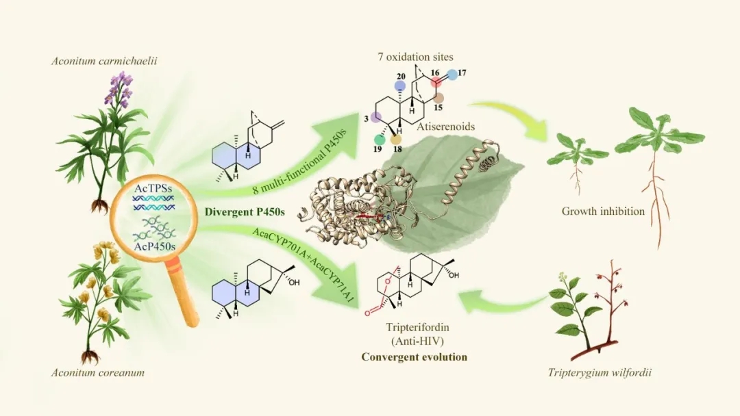 研究揭示了雷公藤福定生物合成在毛茛科黃花烏頭與衛(wèi)矛科雷公藤植物中的趨同進化以及烏頭屬二萜的化感作用及其作為植物生長調(diào)節(jié)劑的開發(fā)應用潛力,為烏頭屬植物復雜結構二萜生物堿的下游生物合成通路解析奠定了基礎。