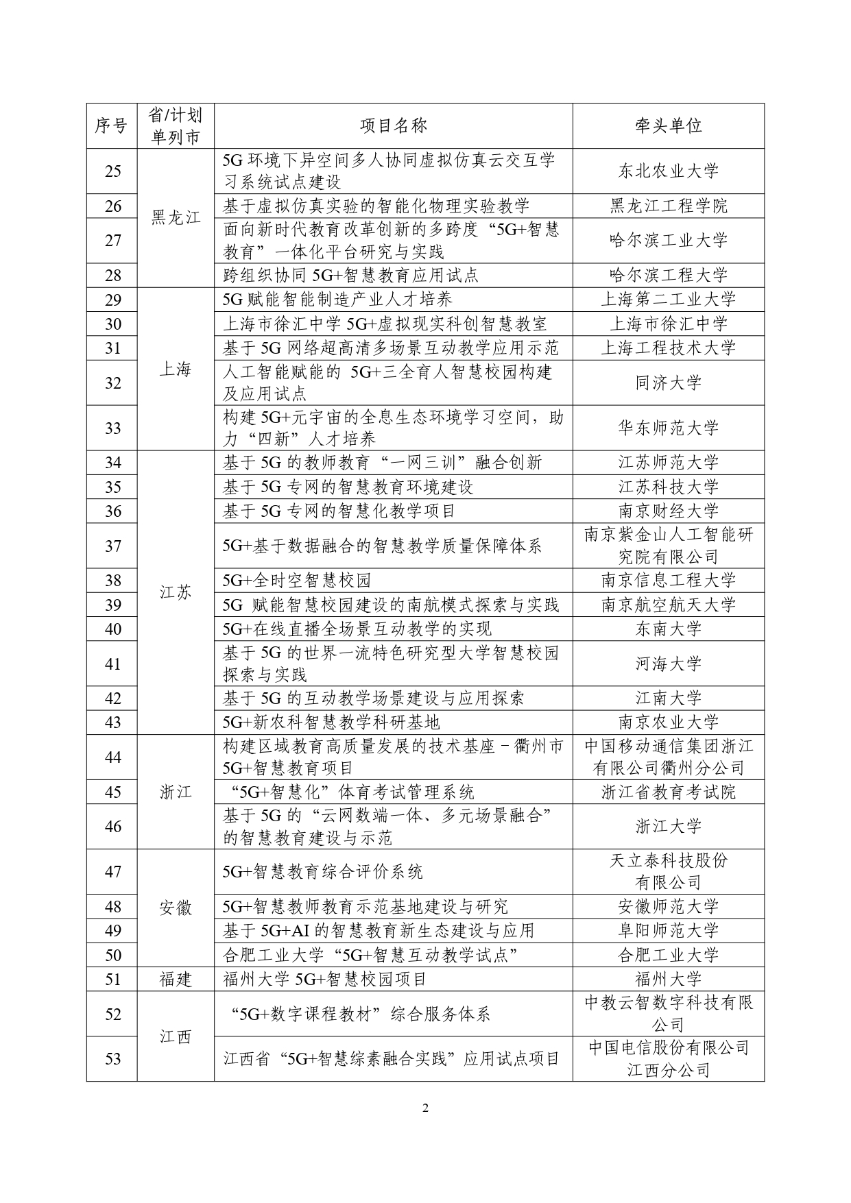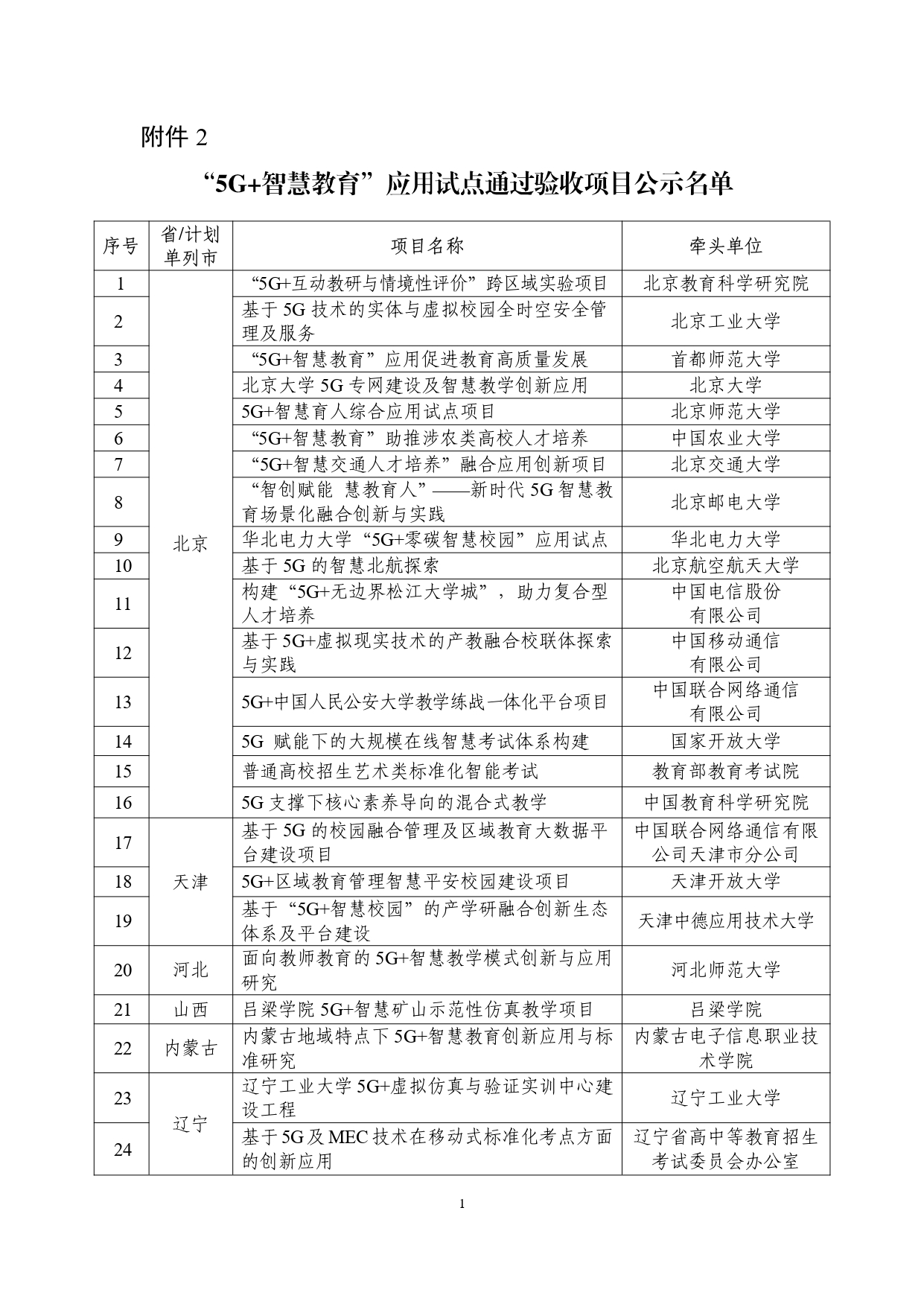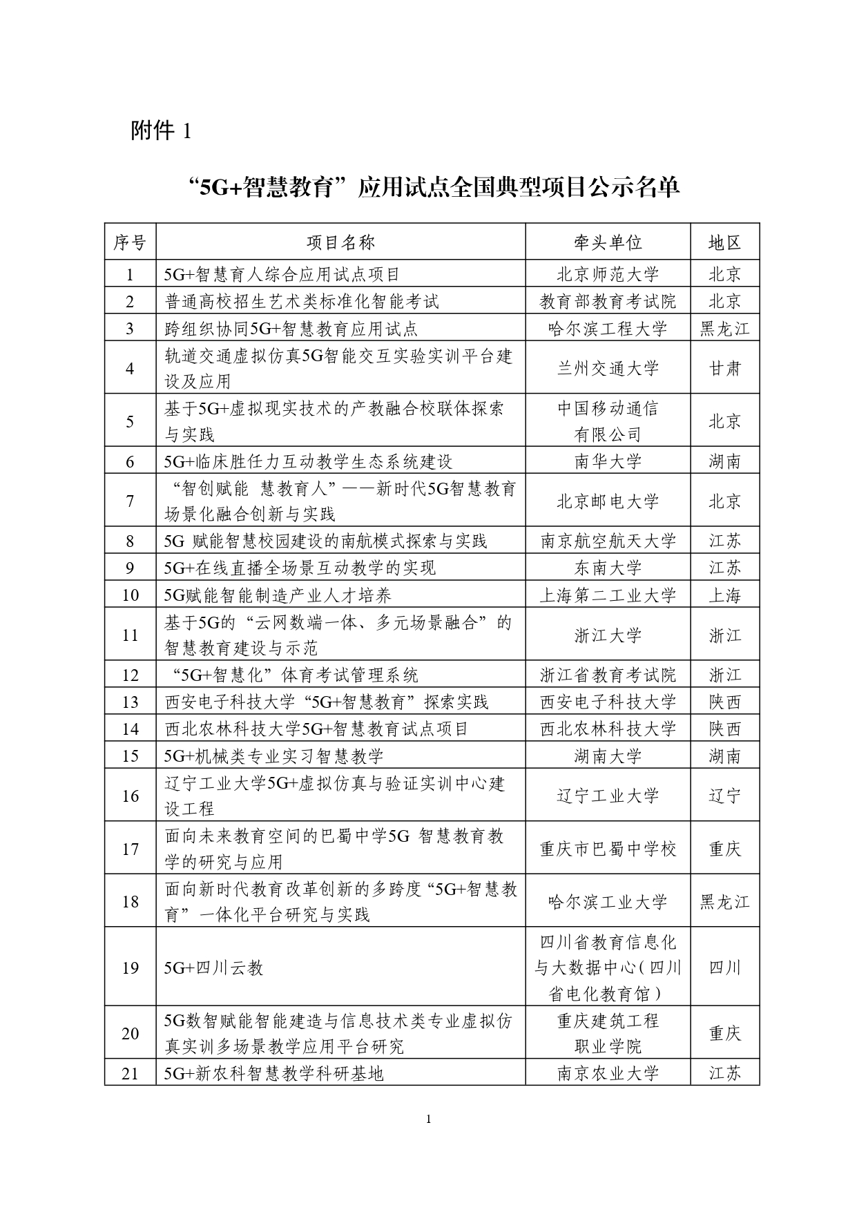 “5G+智慧教育”應用試點全國典型項目和通過驗收項目名單公示