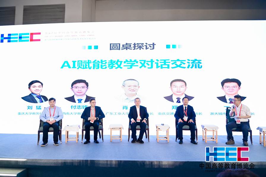 大會最后一個環(huán)節(jié)是主題為“AI賦能教學(xué)”的對話交流。重慶大學(xué)教務(wù)處處長劉猛、西南大學(xué)教務(wù)處處長付志鋒、廣東工業(yè)大學(xué)教務(wù)處副處長肖明、重慶交通大學(xué)教務(wù)處處長鄭丹和浙大城市學(xué)院教務(wù)處處長丁智分別就AI賦能專業(yè)建設(shè)、AI服務(wù)學(xué)生個性化學(xué)習(xí),教育主管部門支持教師持續(xù)發(fā)展等方面的問題闡述了各自觀點(diǎn)。