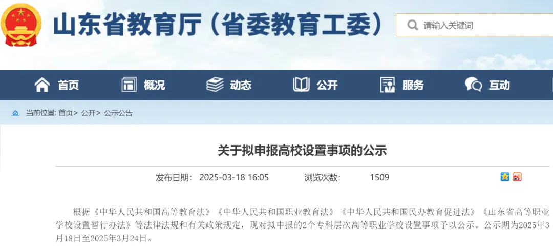 根據(jù)《中華人民共和國高等教育法》《中華人民共和國職業(yè)教育法》《中華人民共和國民辦教育促進法》《山東省高等職業(yè)學校設置暫行辦法》等法律法規(guī)和有關政策規(guī)定,現(xiàn)對擬申報的2個??茖哟胃叩嚷殬I(yè)學校設置事項予以公示。公示期為2025年3 月18日至2025年3月24日。