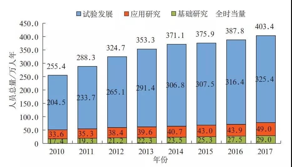 三類研究類型的R&D人員數(shù)量均持續(xù)增加。2017年我國R&D人員(全時當(dāng)量)為403.4萬人年,其中從事試驗發(fā)展的人員有325.4萬人年,占80.7%;從事應(yīng)用研究的人員為49.0萬人年,占12.1%;從事基礎(chǔ)研究的人員為29.0萬人年,占7.2%。2010-2017年,三類研究類型的R&D人員數(shù)量均有不同程度的增長,其中從事基礎(chǔ)研究的R&D人員增速最快。(見圖1)。