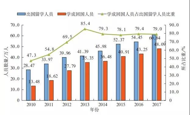 圖2 中國學(xué)成回國人員數(shù)量變化(2010—2017年