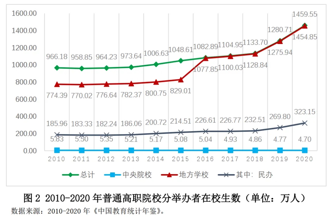 第一,我國高等職業(yè)教育仍處于規(guī)模擴(kuò)張階段。高職學(xué)校數(shù)量從2010年的1246所增加到2020年的1468所,十年間增長了17.82%。高職在校學(xué)生數(shù)十年間增長了32.55%。高職教育經(jīng)費(fèi)投入逐年增長,生均教育經(jīng)費(fèi)投入高于2.2萬元。