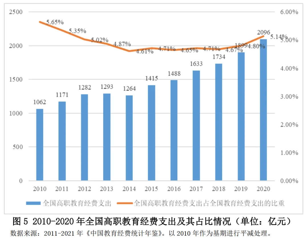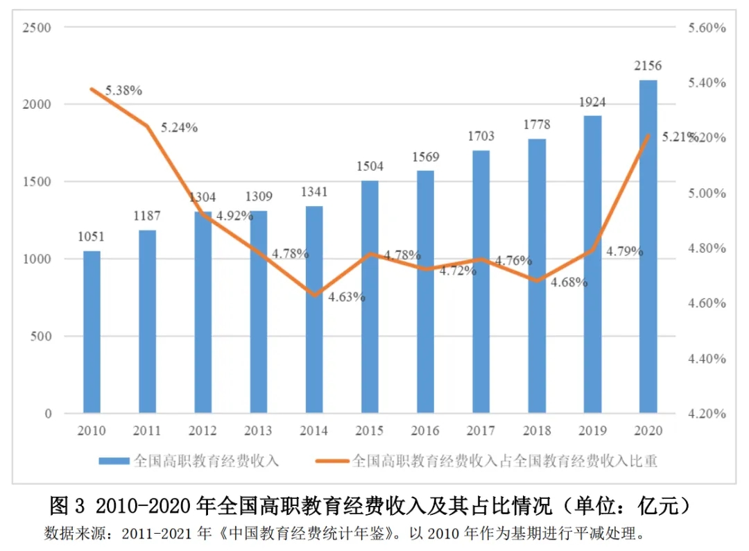 2010年以來,我國高等職業(yè)教育經(jīng)費(fèi)投入逐年增加。2010年,我國高職教育經(jīng)費(fèi)收入為約1051億元,2016年上升為約1569億元,到2020年,我國高職教育經(jīng)費(fèi)投入已經(jīng)達(dá)到約2156億元,增長了約105%?!笆濉币?guī)劃期間,全國高職教育經(jīng)費(fèi)收入占全國教育經(jīng)費(fèi)收入比重穩(wěn)定在4.7%左右,到2019年略有上升,接近4.80%,2020年上升較快,超過了5%。(圖3)