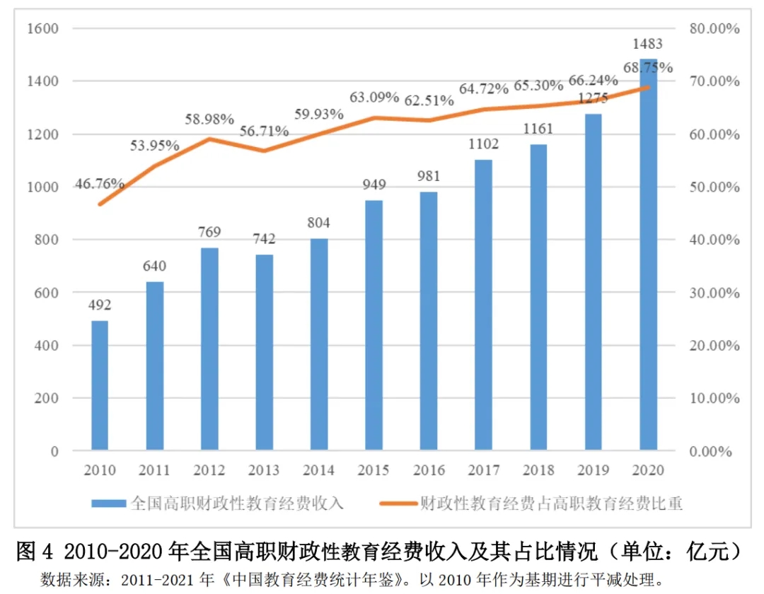 2010年以來,我國高職財政性教育經(jīng)費(fèi)收入增長穩(wěn)定,從2010年的約492億元到2016年的約981億元,再到2020年的約1483億元,增長了約201%,高于我國高職教育經(jīng)費(fèi)總收入增長幅度。高職財政性教育經(jīng)費(fèi)收入占比從2010年的46.76%,上升到2016年的62.51%,再到2020年的68.75%。此外,2010—2020年,高職財政性教育經(jīng)費(fèi)收入占全國財政性教育經(jīng)費(fèi)的比重總體呈現(xiàn)上升趨勢,從2010年的2.51%,到2016年的3.66%,再到2020年的3.58%,表明“十三五”期間國家財政對高等職業(yè)教育的扶持力度不斷加大。(圖4)