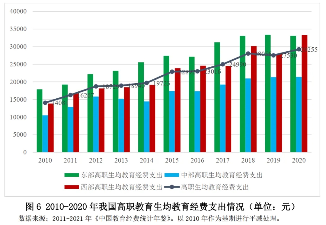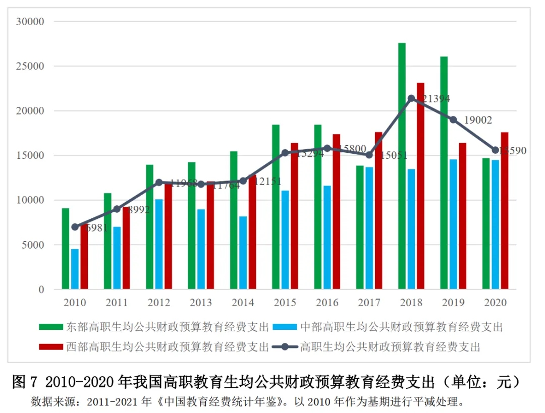 本報告存在以下幾個方面的局限。第一,省際差異基于對《中國教育經(jīng)費(fèi)統(tǒng)計年鑒》的描述統(tǒng)計分析,沒有控制各省份院校類型、規(guī)模和結(jié)構(gòu)以及各省份經(jīng)濟(jì)與人口等因素,因此觀察到的省際差異除了反映各省份政府高職教育投入的努力程度,也反映了各省份社會經(jīng)濟(jì)發(fā)展差異和高等職業(yè)教育體系差異。