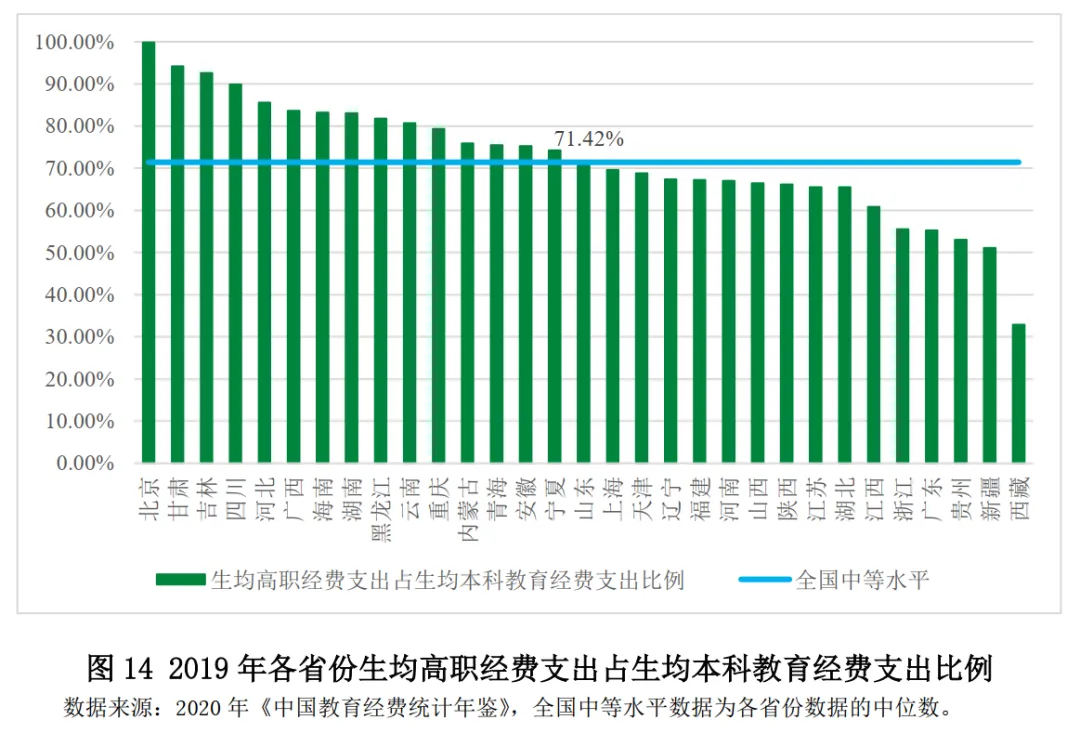 與本科生均教育經(jīng)費(fèi)支出相比,全國高職院校生均教育經(jīng)費(fèi)支出的中位數(shù)約為省本科生均教育經(jīng)費(fèi)支出的71.42%。其中,北京、吉林、甘肅和四川的高職院校生均教育經(jīng)費(fèi)支出占本科生均教育經(jīng)費(fèi)支出的比例超過90%,較為接近同省本科投入水平。同時,西藏、新疆、貴州占比較低,約為同省本科投入水平的50%。(圖14)