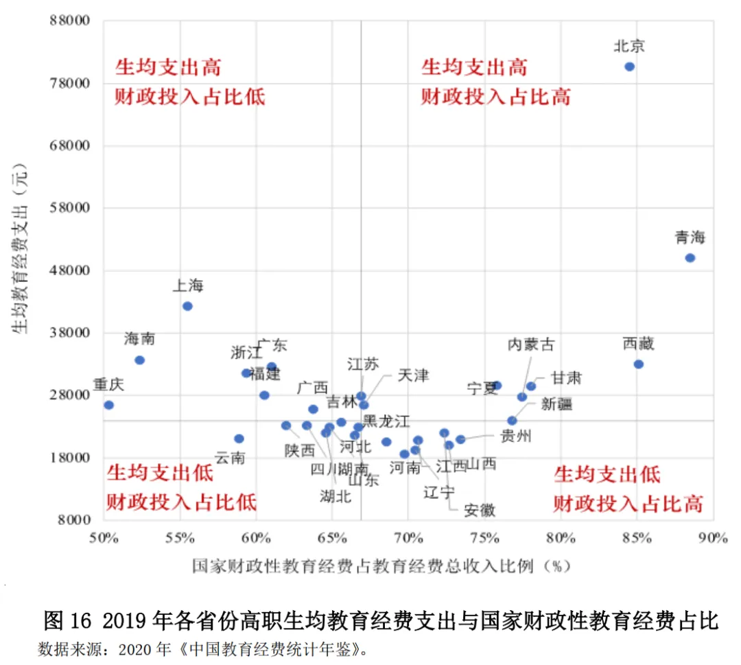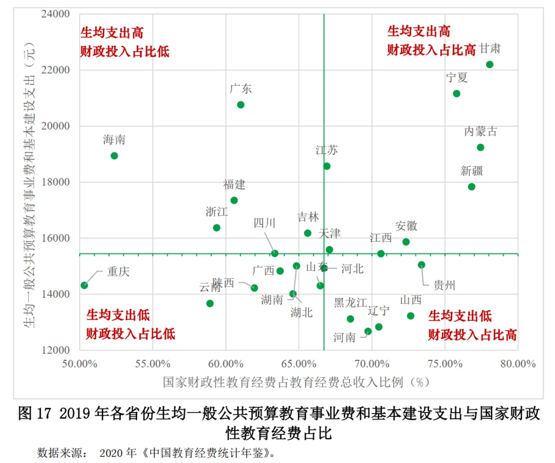 從生均教育經(jīng)費(fèi)支出水平與財政投入程度(以國家財政性教育經(jīng)費(fèi)占教育總經(jīng)費(fèi)收入的比例來衡量)的關(guān)系來看,各省份可以分為四種類型:(1)多數(shù)西部地區(qū)(例如青海、西藏、甘肅、新疆等)和北京屬于生均教育經(jīng)費(fèi)支出和財政投入程度都較高地區(qū);(2)上海、廣東、福建、浙江等東部地區(qū)的生均教育經(jīng)費(fèi)支出較高、但財政投入程度相對較低;(3)河南、江西等省份雖然財政投入程度較高,但是生均教育經(jīng)費(fèi)支出較低;(4)云南、陜西、湖北、湖南等西部和中部省份的生均教育經(jīng)費(fèi)支出和財政投入程度均處于較低的水平。(圖16)