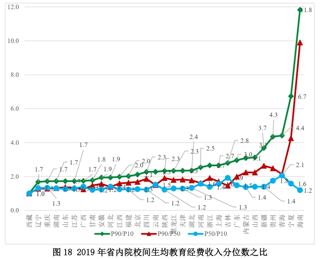 從2019年各省份生均教育經(jīng)費(fèi)收入的分位數(shù)之比來看:(1)西藏、遼寧、重慶、湖南的分位數(shù)之比較小(小于等于1.7),省內(nèi)均衡性位居前列;(2)青海、寧夏、貴州、海南分位數(shù)之比較大(大于等于2),省內(nèi)均衡性位居最末。其中,海南和寧夏的P90/P10分別為11.8和6.7,且省內(nèi)生均教育經(jīng)費(fèi)收入最高的90分位數(shù)學(xué)校與居中的50分位數(shù)學(xué)校差異,遠(yuǎn)大于省內(nèi)居中的50分位數(shù)學(xué)校與最低的10分位數(shù)學(xué)校差異。(圖18)這意味著生均教育經(jīng)費(fèi)收入處于前50%位置的高校間差異是造成省內(nèi)生均教育經(jīng)費(fèi)收入差異的主要原因。
