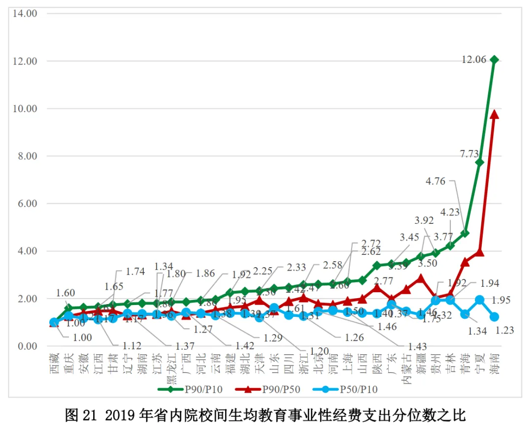 2019年各省份生均教育事業(yè)性經(jīng)費(fèi)支出的分位數(shù)之比表明:(1)西藏、重慶、安徽的省內(nèi)均衡性均位居前列;(2)海南、寧夏、青海位居最末。其中,海南、寧夏、青海內(nèi)部生均教育事業(yè)性經(jīng)費(fèi)支出的最高90%的學(xué)校與最低10%學(xué)校差異最大,且這種差異主要是由于最高90%與中位數(shù)學(xué)校的差異過大,這表明這三個省份內(nèi)部教育經(jīng)費(fèi)投入的均衡性相對較差。(圖21)