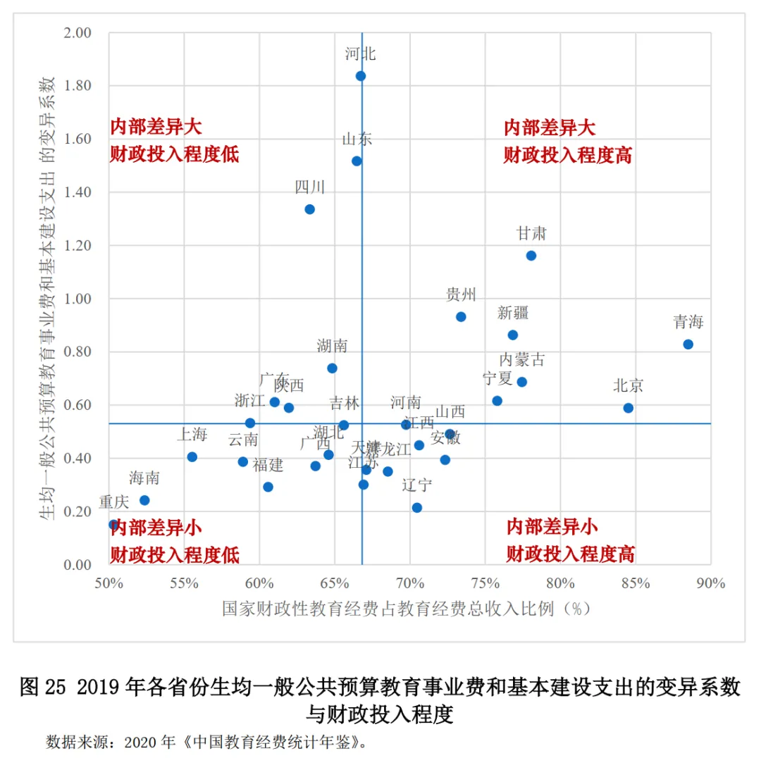 從生均一般公共預(yù)算教育事業(yè)費(fèi)和基本建設(shè)支出的變異系數(shù)與財政投入程度來看,生均一般公共預(yù)算教育事業(yè)費(fèi)和基本建設(shè)支出的省內(nèi)院校間差異小于生均教育事業(yè)性經(jīng)費(fèi)支出。(1)在內(nèi)部差異較大省份中,廣東、陜西、四川、湖南等省份的財政投入程度較低,多數(shù)西部省份和北京的財政投入程度較高;(2)在內(nèi)部差異性較小的省份中,重慶、海南、上海、云南等省份的財政投入程度較低,安徽、江西、遼寧、黑龍江等中部和東北地區(qū)省份的財政投入程度相對較高。(圖25)