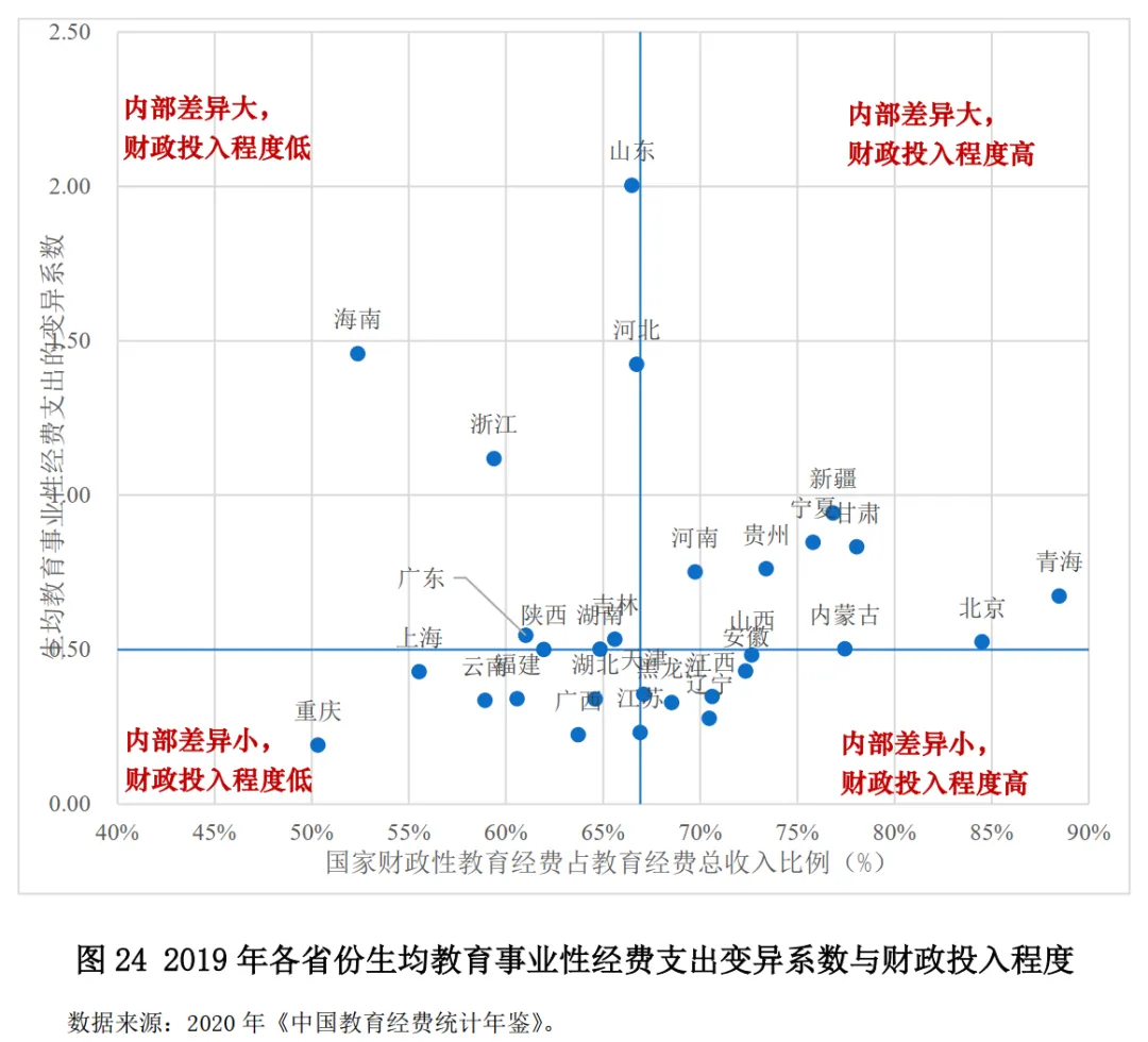 從生均教育事業(yè)性經(jīng)費(fèi)支出的變異系數(shù)與財政投入程度來看,(1)廣東、海南、浙江等省份內(nèi)部的院校間均衡性較弱;(2)廣西、江蘇、遼寧、重慶等省份內(nèi)部的院校間均衡性較強(qiáng);(3)在內(nèi)部差異較大省份中,海南、浙江、廣東等省份的財政投入程度較低,多數(shù)西部省份和北京的財政投入程度較高;(4)在內(nèi)部差異性較小的省份中,重慶、上海、云南等省份的財政投入程度較低,安徽、江西、遼寧、黑龍江等中部和東北地區(qū)省份的財政投入程度相對較高。(圖24)