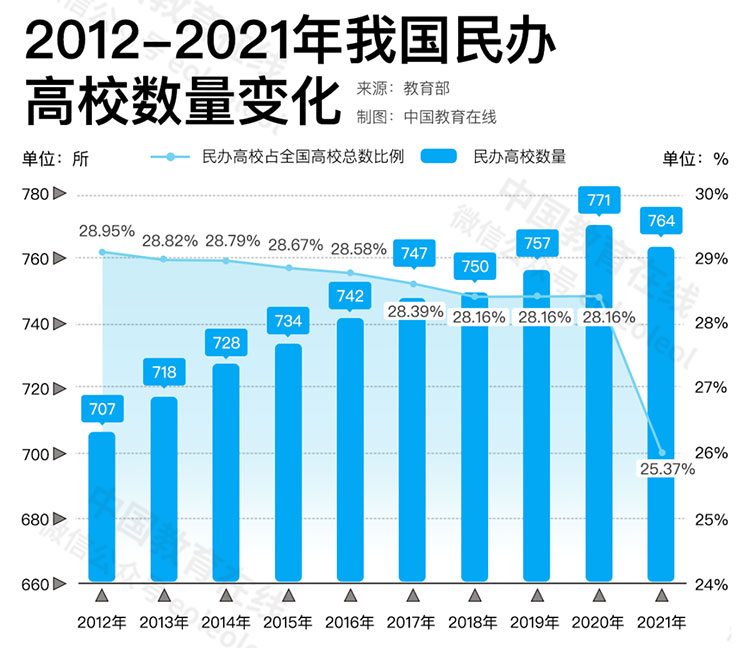 在高校數(shù)量增加的同時,我國獨立學院的數(shù)量在逐年下降。民辦高校的數(shù)量則在經(jīng)歷平穩(wěn)增長之后,在2021年開始下降。