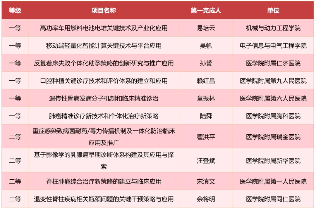 2023年度上海市科學(xué)技術(shù)獎(jiǎng)授獎(jiǎng)214項(xiàng)(人),其中科技功臣獎(jiǎng)2人、青年科技杰出貢獻(xiàn)獎(jiǎng)10人、自然科學(xué)獎(jiǎng)46項(xiàng)、技術(shù)發(fā)明獎(jiǎng)29項(xiàng)、科技進(jìn)步獎(jiǎng)114項(xiàng)、科學(xué)技術(shù)普及獎(jiǎng)9項(xiàng)、國際科技合作獎(jiǎng)4人。上海交通大學(xué)共有25項(xiàng)第一完成單位成果(人)獲得表彰,其中一等獎(jiǎng)16項(xiàng),二等獎(jiǎng)6項(xiàng),醫(yī)學(xué)院附屬第一人民醫(yī)院林浩東教授榮獲青年科技杰出貢獻(xiàn)獎(jiǎng),數(shù)學(xué)科學(xué)學(xué)院岳爾根·約斯特教授和醫(yī)學(xué)院附屬仁濟(jì)醫(yī)院雷內(nèi)·貝爾納茨教授榮獲國際科技合作獎(jiǎng),一等獎(jiǎng)獲獎(jiǎng)數(shù)蟬聯(lián)上海市首位。