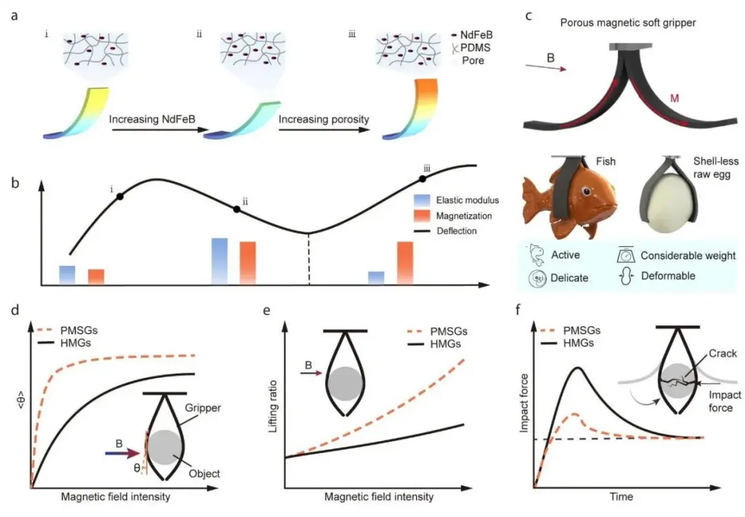 這種將多孔結(jié)構(gòu)引入磁性硅膠彈性體制造抓手的方法,使抓手具備高磁化、低模量和粗糙表面的特點,使其在保持強大抓取力的同時,也能夠適應(yīng)各種不同的場景,展現(xiàn)出柔軟與速度的完美平衡。