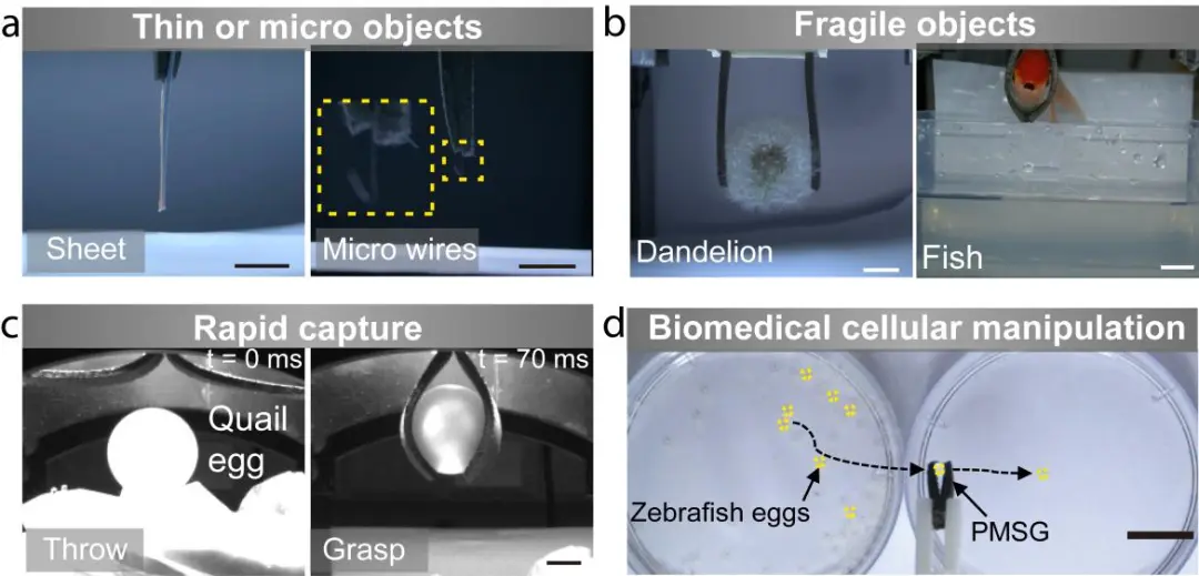 軟體抓手的多功能性展示:(a)抓取薄板和細線;(b)抓取魚和蒲公英;(c)抓取去殼生蛋;(d)安全移取斑馬魚卵。