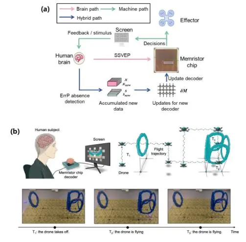 (a)腦-憶阻器交互式更新框架;(b)基于憶阻器腦電解碼的實(shí)時(shí)腦控?zé)o人機(jī)飛行。