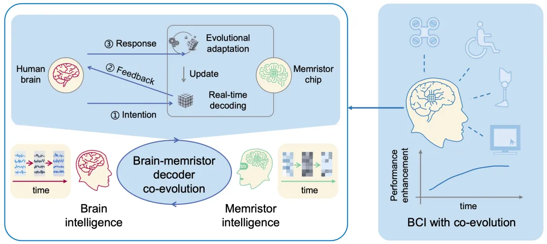 “這項(xiàng)研究首次提出了腦機(jī)協(xié)同演進(jìn)的概念,并基于憶阻器神經(jīng)形態(tài)器件完成了技術(shù)驗(yàn)證,通過長(zhǎng)時(shí)程大腦與憶阻器神經(jīng)形態(tài)器件之間的信息交互初步實(shí)現(xiàn)了生物智能與機(jī)器智能的互適應(yīng)、互學(xué)習(xí),為未來(lái)實(shí)用型腦機(jī)接口系統(tǒng)提供了重要的理論基礎(chǔ)與技術(shù)支撐,也為腦機(jī)融合智能的發(fā)展開辟了新的方向?!眹?guó)家高層次人才計(jì)劃入選者、天津大學(xué)腦機(jī)海河實(shí)驗(yàn)室許敏鵬教授表示?!拔覀冞@款系統(tǒng)未來(lái)計(jì)劃拓展到更多便攜式或可穿戴腦機(jī)接口設(shè)備中,服務(wù)于消費(fèi)級(jí)、醫(yī)療級(jí)等各類智能人機(jī)交互實(shí)用場(chǎng)景?!?/p>