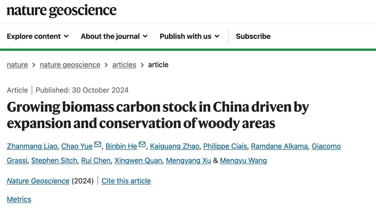 論文信息:Liao, Z., Yue, C., He, B. et al. Growing biomass carbon stock in China driven by expansion and conservation of woody areas. Nat. Geosci. (2024). https://doi.org/10.1038/s41561-024-01569-0