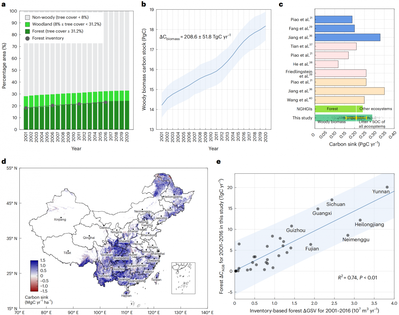 圖1 基于衛(wèi)星遙感觀測(cè)的2001-2020年中國(guó)森林面積和木本植被生物量碳儲(chǔ)量動(dòng)態(tài)變化結(jié)果。(a) 2001–2020森林、灌木和非林地面積變化。(b) 2001–2020森林生物量碳庫(kù)變化。(c) 本研究量化的森林碳匯與其他研究間的比較。(d) 森林碳匯的空間分布。(e) 基于衛(wèi)星遙感的各省森林地上生物量碳匯與基于森林清查的材積變化顯著正相關(guān)。