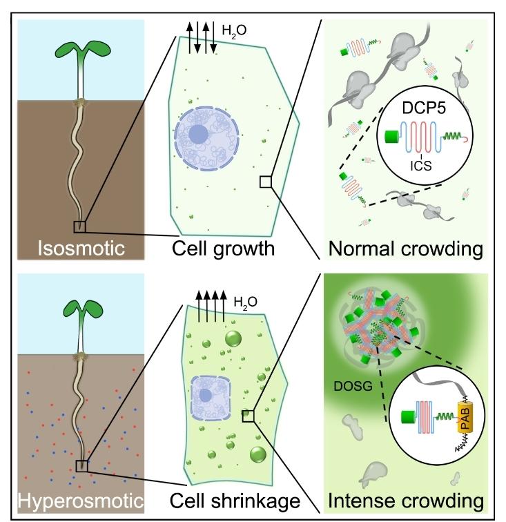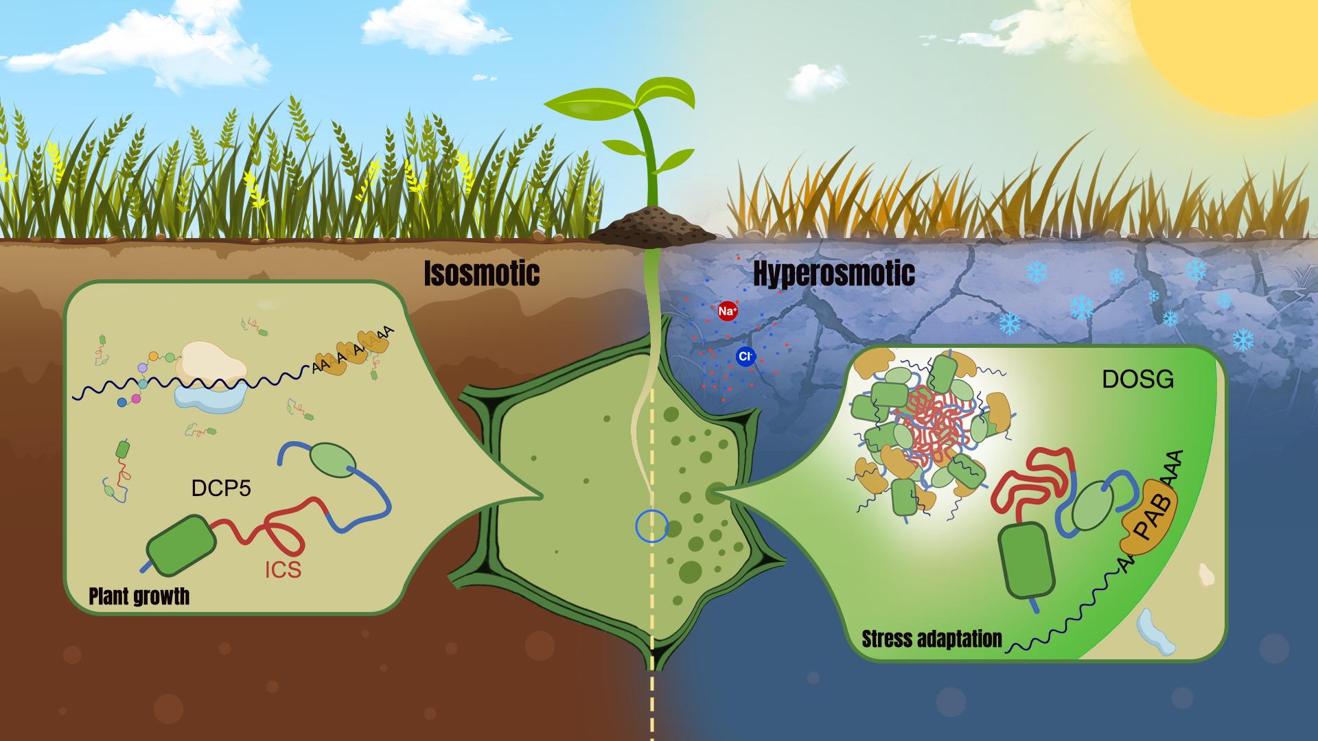 綜上所述,團(tuán)隊(duì)在該研究中發(fā)現(xiàn)了分子擁擠敏感蛋白 DCP5 可作為多功能的植物滲透感受器 (osmosensor),通過相分離介導(dǎo)一個(gè)細(xì)胞質(zhì)中滲透脅迫感知與適應(yīng)的全新機(jī)制。該機(jī)制的發(fā)現(xiàn)證實(shí)了細(xì)胞滲透壓感知可在細(xì)胞內(nèi)部非膜結(jié)構(gòu)實(shí)現(xiàn)的猜想。與經(jīng)典的由信號(hào)轉(zhuǎn)導(dǎo)過程實(shí)現(xiàn)的滲透脅迫應(yīng)答途徑不同,DCP5 在感知滲透脅迫的同時(shí)直接實(shí)現(xiàn)了脅迫應(yīng)答,無需額外的信使分子參與,因而更具時(shí)效性。而由 DOSG 裝配引發(fā)的翻譯調(diào)控也代表了植物滲透脅迫適應(yīng)過程中的一個(gè)新層次。此外,該研究也為蛋白無序區(qū)作為胞內(nèi)環(huán)境理化性質(zhì)感受器的觀點(diǎn)提供了重要的實(shí)驗(yàn)證據(jù)。
