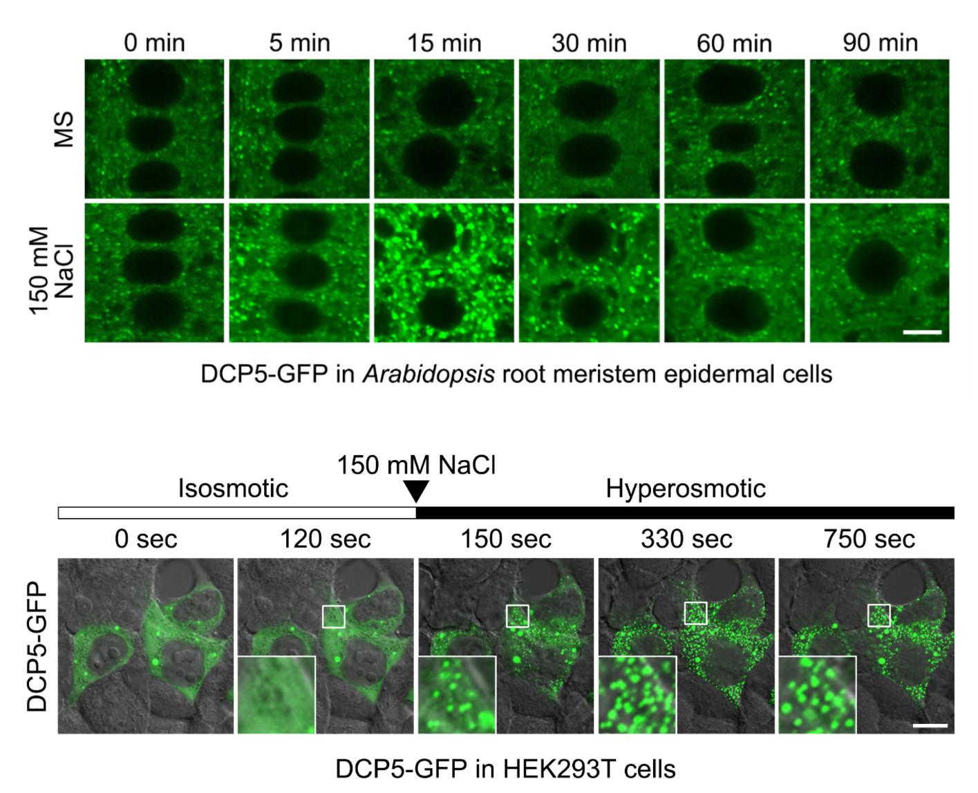 郭紅衛(wèi)團(tuán)隊(duì)在研究擬南芥 RNA 降解相關(guān)蛋白的過程中,意外觀察到原本均勻分散在細(xì)胞質(zhì)中的 Decapping 5 (DCP5) 蛋白會(huì)在植物暴露于高滲脅迫后迅速發(fā)生凝聚,形成大量類似于液滴的凝聚體。該凝聚現(xiàn)象與細(xì)胞體積因失水而縮小的趨勢高度相關(guān),當(dāng)細(xì)胞體積重新恢復(fù)或高滲脅迫撤去之后,這些凝聚體又逐步分散消失。DCP5 迅速、可逆的凝聚行為以及 DCP5 凝聚體的液體性質(zhì)暗示該凝聚現(xiàn)象很可能由蛋白質(zhì)的液液相分離 (liquid-liquid phase separation, LLPS) 所介導(dǎo)。研究人員通過相關(guān)實(shí)驗(yàn)證實(shí),DCP5 的確具有相分離的能力,可在體內(nèi)及體外的大分子擁擠環(huán)境中發(fā)生相分離。這初步解釋了 DCP5 能夠通過凝聚響應(yīng)高滲脅迫的原因。